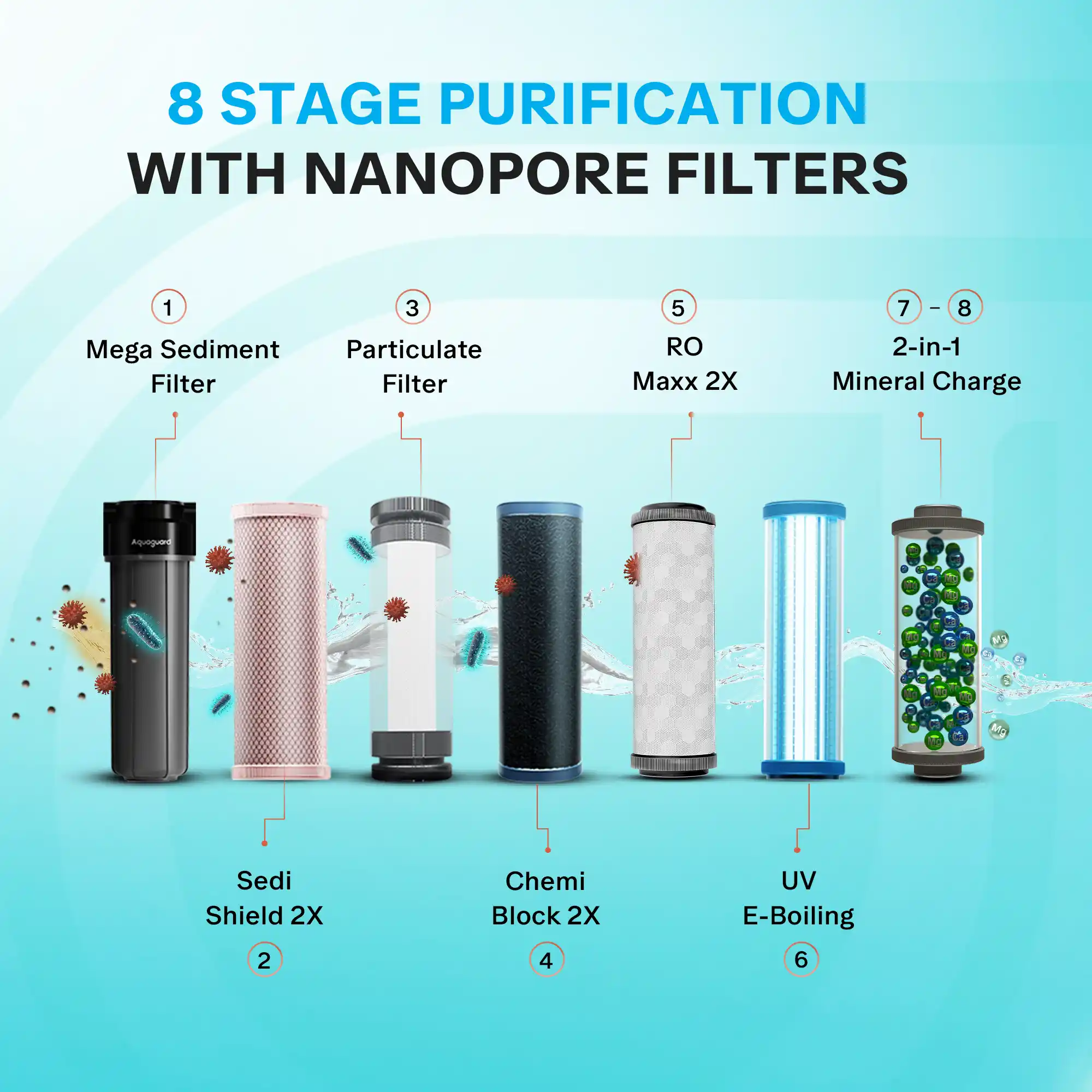 The Aquaguard Vector RO+UV+MC 2X Water Purifier delivers superior purification with cutting-edge technology designed to provide safe, healthy, and great-tasting drinking water from any source. Powered by NanoPore RO 2X Filter Technology, it offers complete protection against harmful contaminants such as pesticides, microplastics, and industrial waste like lead and mercury, ensuring reliable purification for up to 2 years